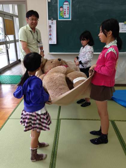 毛布の担架で人を運ぶ体験