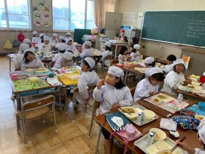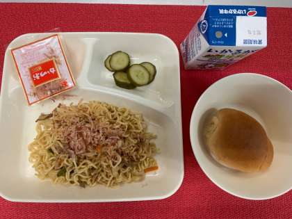 2学期の給食が始まりました。今日の献立は、『和風焼きそば・きゅうりのゆず風味・黒糖パン・牛乳』でした。
