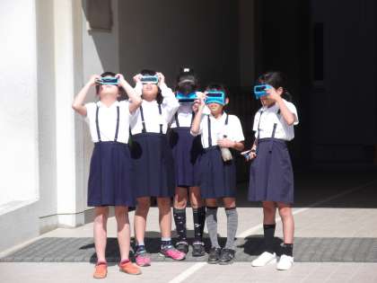 3年生の子ども達が、太陽メガネやデジタルカメラをもち