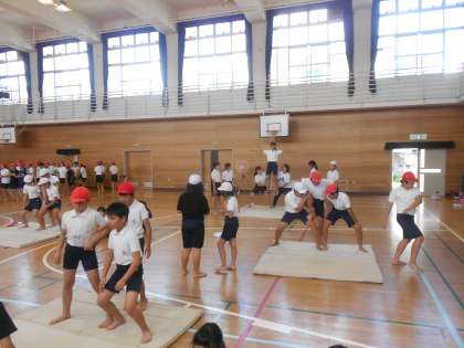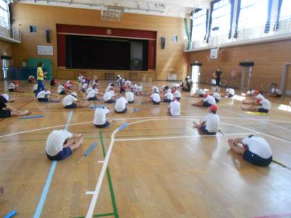 6年生は体育館で、3時間目と5時間目に練習しました。フラッグだけでなく、器械体操的な運動も取り入れているので、練習する内容が多いですが、とてもがんばっています。