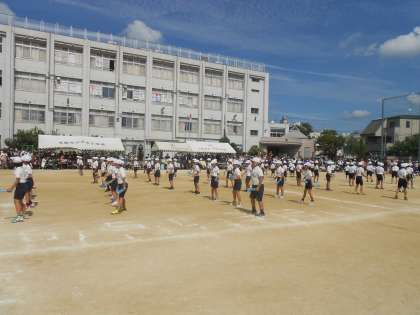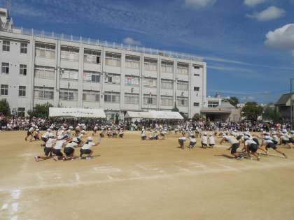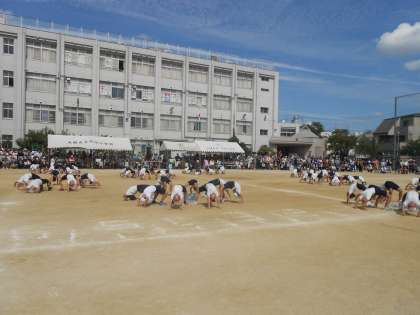 3年生の団体演技の様子です。カラフルなペットボトルを打ち鳴らし、ダンスするのは難しかったですが、見事に演技できました。途中でブリッジなども取り入れていました。