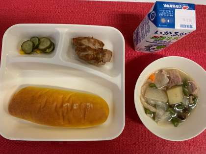 今日の献立は、『鶏肉のみそマリネ焼き(ノンエッグドレッシング)・スープ煮・きゅうりとコーンのサラダ・パンプキンパン・牛乳』でした。