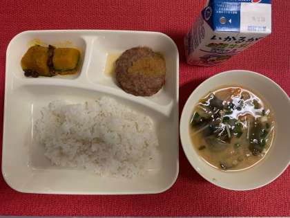 今日の献立は、『和風おろしハンバーグ・みそ汁・かぼちゃのいとこ煮・米飯・牛乳』でした。