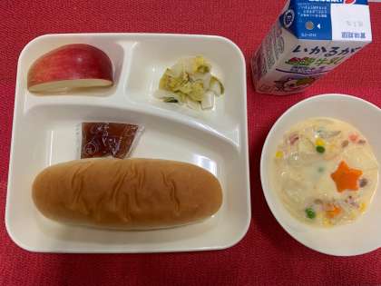 今日の献立は、『コーンクリームシチュー(米粉)・はくさいのピクルス・りんご・コッペパン・いちごジャム・牛乳』でした。