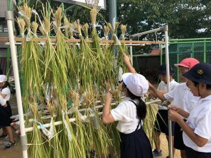 収穫したお米は、この後10日間ほど干します。大切に育てたお米は家庭科の調理実習でみんなでおいしくいただきたいと思います。