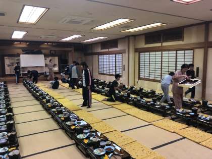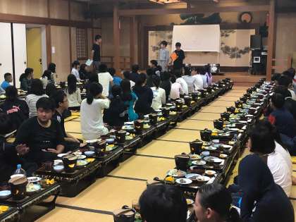 大広間での夕食です。食事係の子どもたちもお手伝いをしています。
