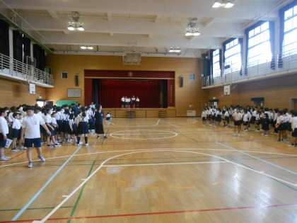 児童集会がありました。子どもたちは体育館全体を使い、〇×クイズをしました。「古市小学校の職員数は30人より多い」などの問題がありました。