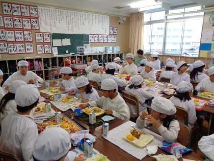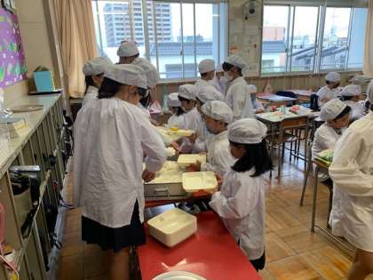 今日は、2学期のなかよし給食でした。たてわり班のメンバーで協力して準備をしたり、低学年の児童が食べられる量を調整したりして、楽しく給食の時間を過ごすことができました。