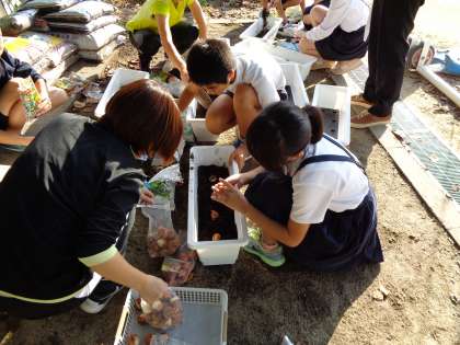 委員会活動の時間にも、環境委員会の子どもたちがチューリップの球根を寄贈していただいたプランターに植えました。みんなで大切に育てていきます。