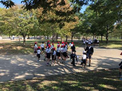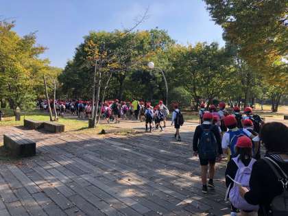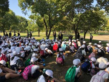 予定通り鶴見緑地に到着しました。開会式を終え、班に分かれてオリエンテーリングに出発しました。