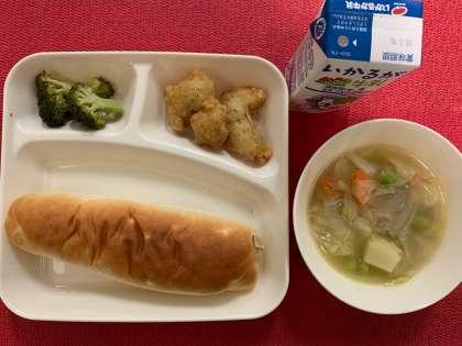 今日の献立は、『白身魚のフリッター・スープ煮・ブロッコリーのサラダ・おさつパン・牛乳』でした。