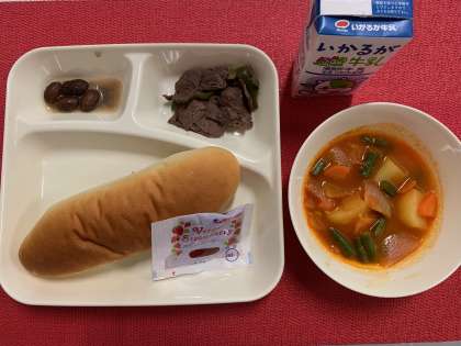今日の献立は、『牛肉の香味焼き・ケチャップ煮・うずら豆のグラッセ・コッペパン・いちごジャム・牛乳』でした。