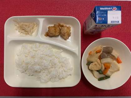今日の献立は、『あげどりのねぎだれかけ・含め煮・もやしのゆずの香あえ・米飯・牛乳』でした。