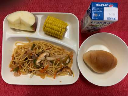 今日の献立は、『きのこのスパゲッティ・焼きとうもろこし・りんご・黒糖パン・牛乳』でした。
