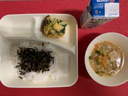今日の献立は、『千草焼き・みそ汁・ごまひじき・米飯・牛乳』でした。