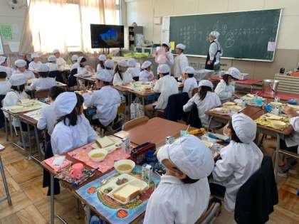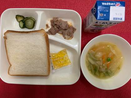今日の献立は、『豚肉のデミグラスソース・スープ・きゅうりのサラダ・食パン・マーマレード・牛乳』でした。