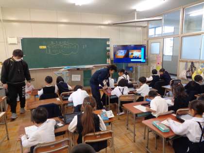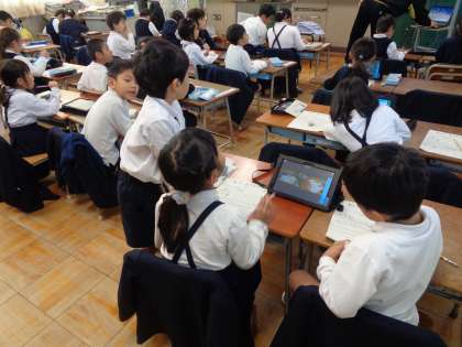 1年生は図画工作の学習で、タブレットを活用し、友だちの作品を鑑賞しました。子どもたちは画面をみながら感想を交流することができていました。