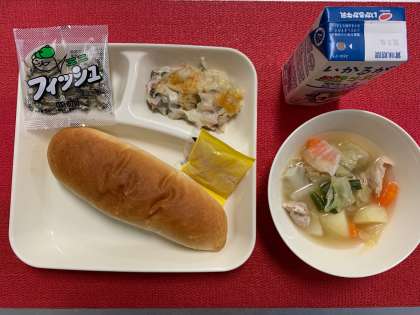 今日の献立は、『鶏肉とじゃがいものスープ煮・きのこのドリア・ミニフィッシュ・コッペパン・アプリコットジャム・牛乳』でした。