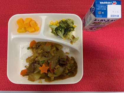 今日の献立は、『冬野菜のカレーレイス・ブロッコリーとコーンのサラダ・黄桃(カット缶)・牛乳』でした。