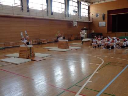 6年生の体育の様子です。跳び箱を使って学習していました。開脚飛び、閉脚飛び、台上前転の練習を行っていました。