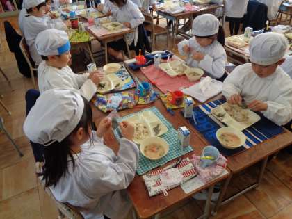 給食も今日から始まりました。今日の献立は、れんこんのちらしずし、お雑煮、ごまめでした。お正月の献立に子どもたちは喜んで食べていました。
