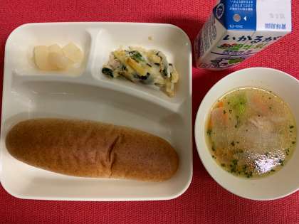 今日の献立は、『マカロニグラタン・だいこんスープ・和なし(カット缶)・ライ麦パン・牛乳』でした。