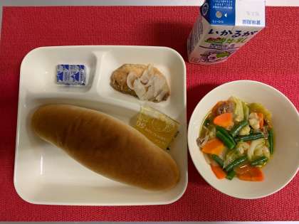 今日の献立は、『あじのレモンマリネ・てぼ豆のスープ煮・固形チーズ・コッペパン・マーマレード・牛乳』でした。