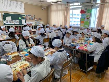 あじのレモンマリネは、あじを揚げ、いためたたまねぎとレモン果汁などで作ったマリネ液をからませています。レモン果汁は生のレモンを給食室でひとつひとつ搾っています。