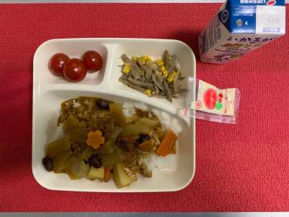 今日の献立は、『豚肉と金時豆のカレーライス・ごぼうサラダ・プチトマト・牛乳』でした。