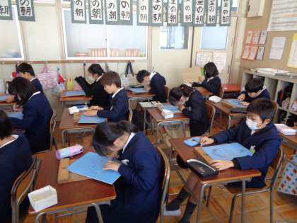 6年生は自分の肖像画を版画の作品にします。誰一人と私語をすることなく彫刻刀で彫っていました。