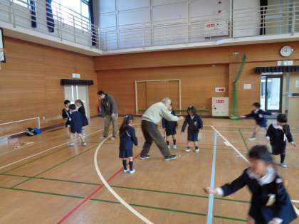 1年生が昔の遊びを、地域の昔遊び先生に教えていただいて遊びました。