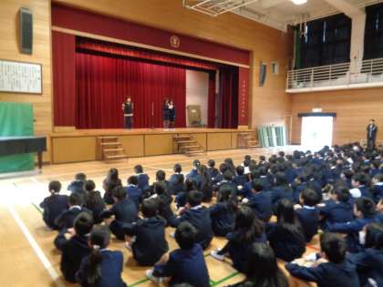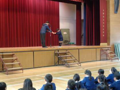 児童朝会では、先週に引き続き、旭区民マラソン大会の表彰状を披露しました。5km低学年の部で見事に優勝した児童の紹介をさせてもらいました。立派な金メダルもいただいていました!