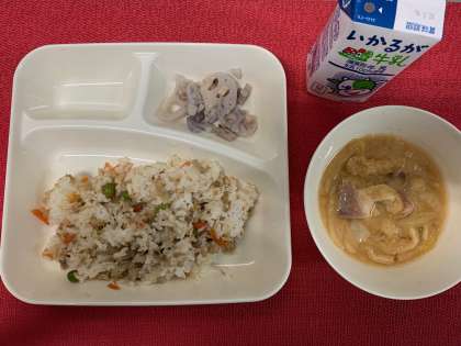 今日の献立は、『鶏ごぼうご飯・みそ汁・焼きれんこん・牛乳』でした。