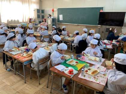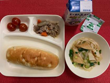 今日の献立は、『豚肉とごぼうの煮もの・なにわうどん・プチトマト・おさつパン・牛乳』でした。