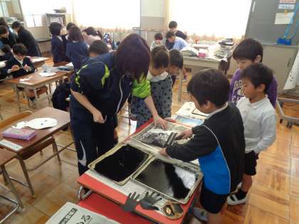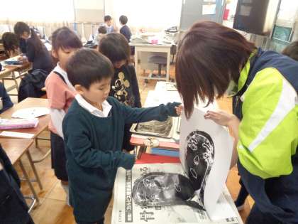 1年生では、初めての紙版画に取り組んでいます。自分の肖像画と自分の手を書き写した手形を版画にしました。一生懸命取り組んでいますし、作品も大変立派に仕上がりました。