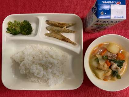 今日の献立は、『きびなごてんぷら・一口がんもとじゃがいもの煮もの・ブロッコリーのごまあえ・米飯・牛乳』でした。