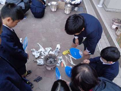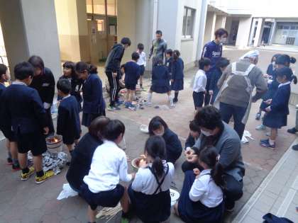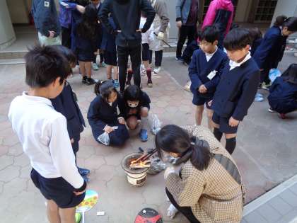 七輪を使っての火おこしは、本当に苦労していました。まず、マッチを擦ることができませんでした。マッチの持ち方から教えていただき、なぜ、うちわと仰がないといけないかを教えていたがきました。みんな苦労しながら地域の皆さんにご指導いただき、火をおこしていました。