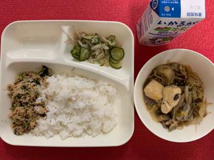 今日の献立は、『すきやき煮・もやしときゅうりのしょうがづけ・ツナっ葉いため・米飯・牛乳』でした。