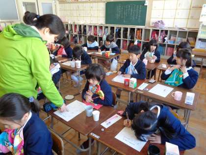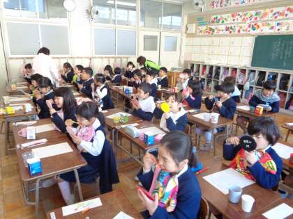 2年生歯磨き指導の様子です。子どもたちは、鏡を見ながら1本1本ていねいに磨いていました。感想もしっかり書くことができていました。