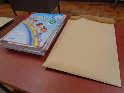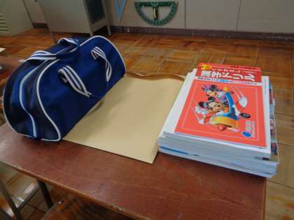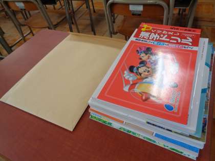 4年・5年の配布物です。5年生は絵の具セット等が残っているお子様は一緒に机に置いています。可能でありましたらお持ち帰りください。