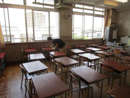 4年生の教室での様子です。算数や国語の学習を課題プリントや教科書を使って行っていました。子どもが入れ替わる間に、担任の先生は消毒を行っています。