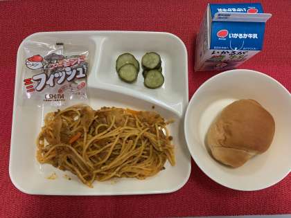 今日の献立は、『スパゲッティミートソース・きゅうりのピクルス・アーモンドフィッシュ・黒糖パン・牛乳』でした。