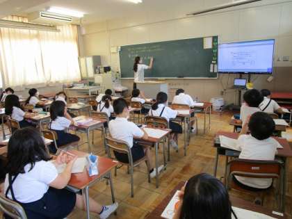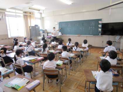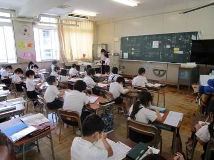 教室では全員そろっての授業が始まりました。座席の間隔は空けるようにはしていますが、人数が多い学年はかなり厳しいです。低学年の子どもたちは楽しく授業を受けていました。