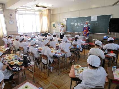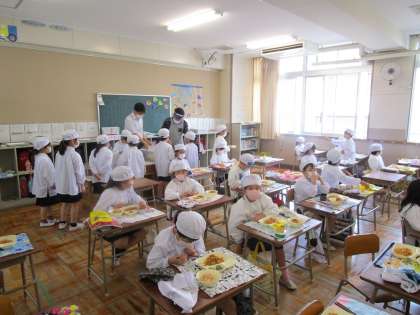 給食の様子です。今日から通常の給食が始まりました。子どもたちも給食当番を行います。今までのようにグループで食べることはできませんが、先生と一緒に気を付けて配膳も行うことができていました。