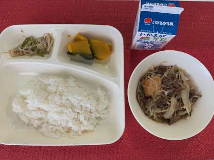 今日の献立は、『すき焼き煮・焼きかぼちゃの甘みつかけ・もやしとピーマンのごまいため・米飯・牛乳』でした。