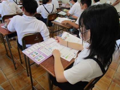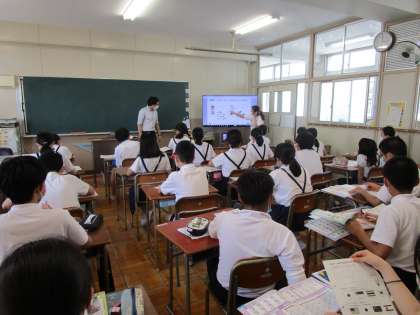 6年生、外国語の授業の様子です。5年生以上に長い英文を聞きながらメモを書きます。単語もたくさん出てきますので、子どもたちは一生懸命聞き取りをしていました。単語を書く場面が多く、I like 〜 、I can 〜 など英文を作っています。