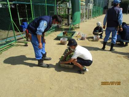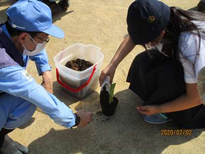 環境委員会の子どもたちは「ハナショウブ」の株分けをしました。旭区の区花「ハナショウブ」の株を区役所のみなさんに持ってきていただき、毎年栽培しています。水の加減が難しく、育てるのに毎年苦労しています。今日もたくさんポイントを教えていただきました。花が咲くことを願っています。