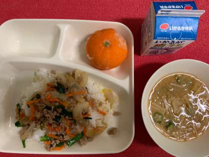 今日の献立は、『豚ミンチとニラのそぼろ丼・オクラのみそ汁・冷凍みかん・牛乳』でした。