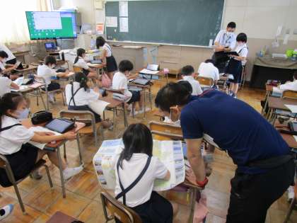 3年生は、学級を2分割して算数の学習を行っていました。棒グラフの学習に取り組んでいました。社会科の学習では、大阪市で商店がたくさん集まっている地域を調べていました。タブレットを使い、ICT支援員さんもサポートしていただいています。3年生の子どもたちは熱心に学習に取り組むことができています。