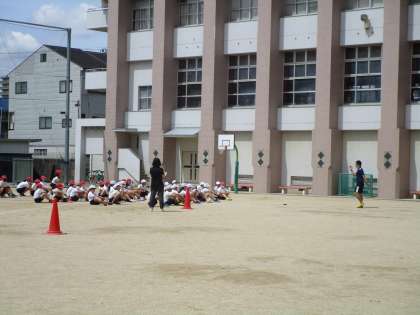 6年生は、中学校から来ていただいている体育の先生に短距離走の走り方を学んでいました。